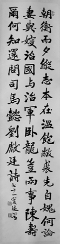 萧蜕的书法,篆书成就最高。陆家衡先生在《临萧退庵天一阁石鼓临本跋》中又记道:“余尝闻前辈云,蜕公晚年客居苏城,喜早茶。每至茶肆,必携说文以随,人皆奇之。有持唐诗慕名求书者,公不加思索,即挥就,篆法竟无一讹误。其精熟若此,令人叫绝。”精通小学也是萧蜕书法有大成就的重要原因。书法是萧蜕证道悟道的手段和成果,但没有学问,没有思想,没有于技艺千锤百炼的勤奋,实在是不可能的事。