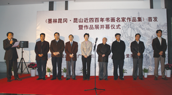 经过了一年的筹备,2009年11月17日上午,《墨林昆冈•昆山近四百年书画名家作品集》首发暨作品展开幕仪式在昆山市昆仑堂美术馆隆重举行。本次活动由中共昆山市委宣传部主办,昆山市文广局、文联、昆仑堂美术馆承办。市委常委宣传部长杭颖、市政府副秘书长蔡坤泉、宣传部副部长兼昆山日报主编高巧林、宣传部副部长兼文明办主任金建鸿、文广局局长赵红骑、文联主席郁建中等领导和书画家计200多人出席了活动。故宫博物院原副院长、国家文物鉴定委员会委员、昆仑堂美术馆学术顾问杨新,中央美术学院教授、国家文物鉴定委员会委员、昆仑堂美术馆学术顾问薛永年出席本次活动并作了重要讲话。杭颖部长在首发式上说,昆山在经济社会快速发展的同时,文化建设和发展取得了跨越式进步。本次活动是文化昆山建设浓墨重彩的一笔,以后还要围绕文化昆山建设做足文章,传承和弘扬传统文化,建设和发展现代文化。杨新先生认为,昆山自古以来就是一个人才辈出的地方,我们国家的文化建设要依靠各地方的努力,昆仑堂美术馆所作的工作非常不容易,他充分肯定了昆山出版这样一本书、举办这样一次展览的重要意义。薛永年先生也认为昆山在古代就代有高人,他肯定了昆山的发展,特别是文化建设方面的发展,是由于昆山政府对文化建设的重视和支持。他对本次活动也作出了高度的评价:“这么多的珍品佳作,可以说昆山这个地方在历史上也是卧虎藏龙。”最后他指出:“我们要把收藏、把收藏的传播,把对传统的弘扬和进一步建设我们新的文化做得更好。”活动仪式由昆仑堂美术馆馆长俞建良主持。仪式结束后与会者参观了展览,共同鉴赏这批具有地方特色的名家书画珍品。